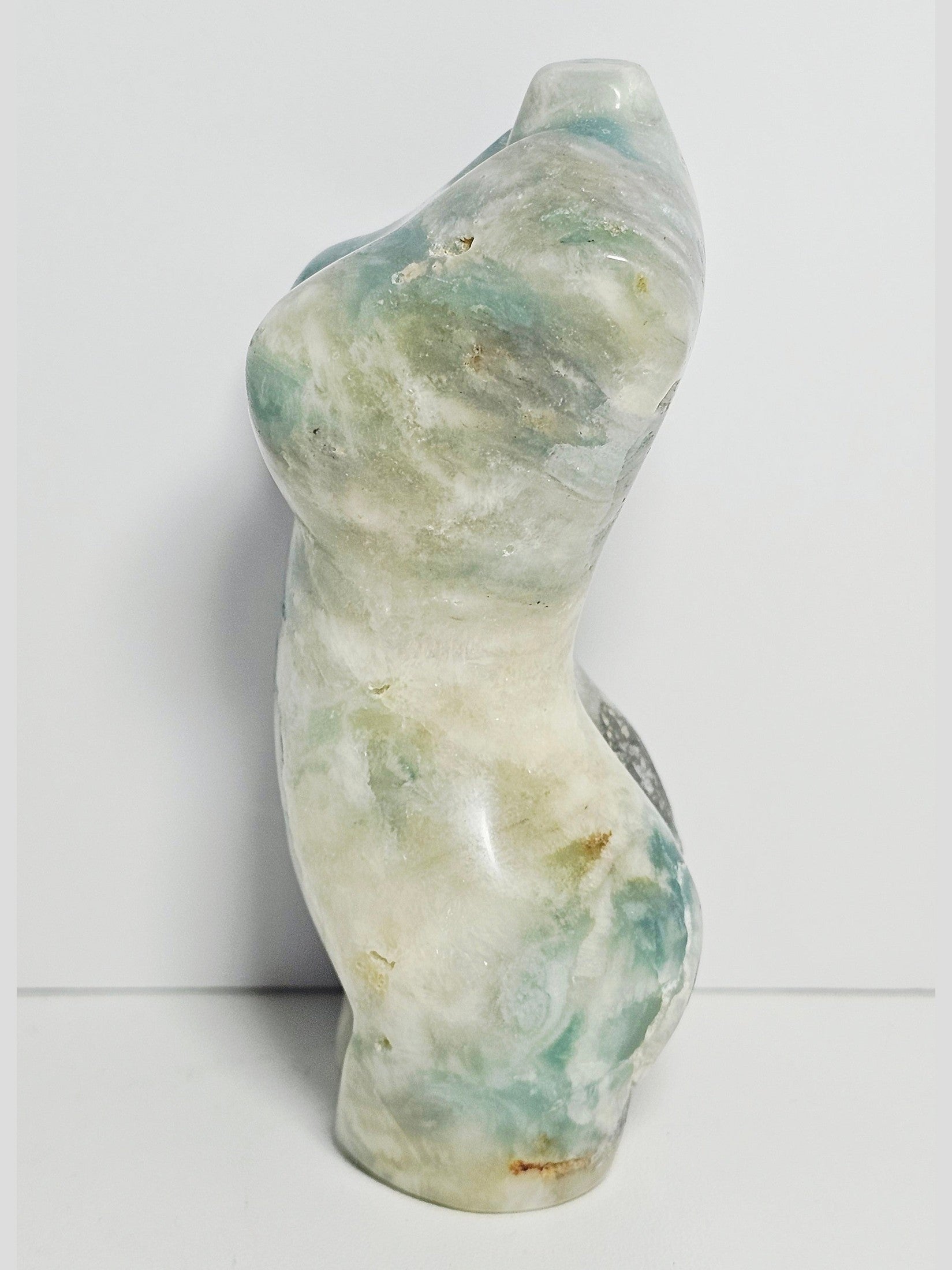 Caribbean Calcite is known for soothing emotional turbulence and enhancing intuition, while Pyrite anchors those energies, creating a perfect harmony of peace and empowerment. The feminine form embodies divine grace, renewal, and creative flow - a statement piece for altars, meditation spaces, or elegant home decor.