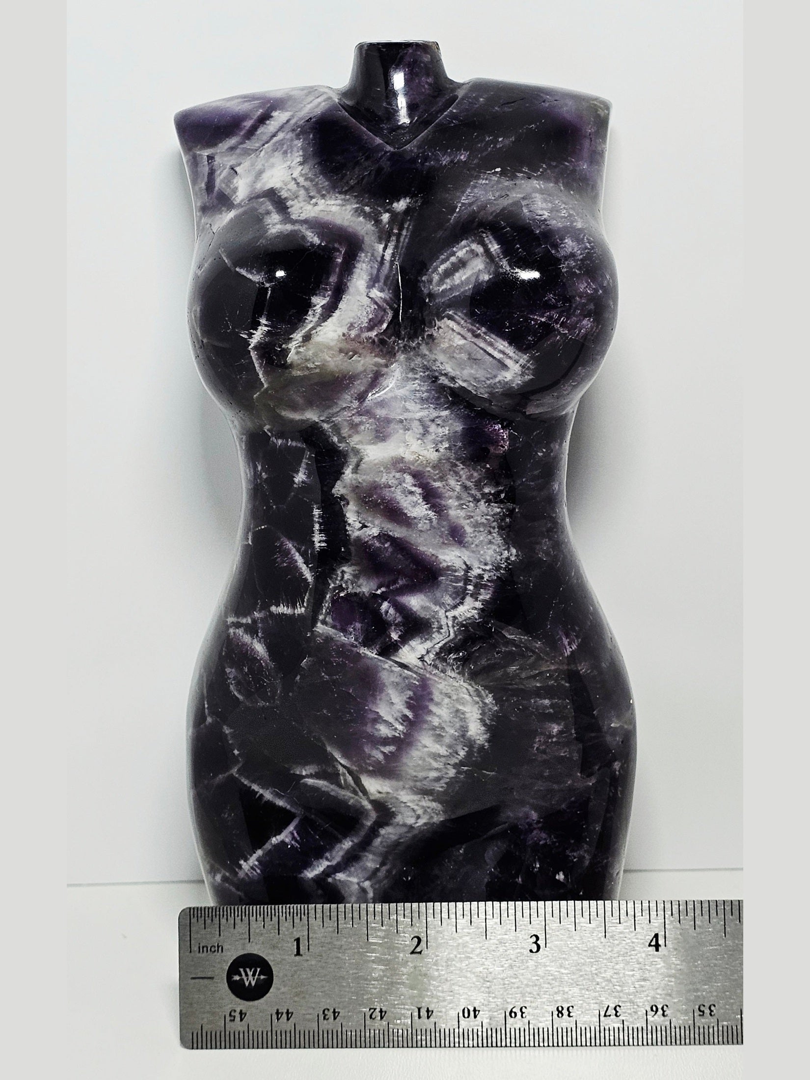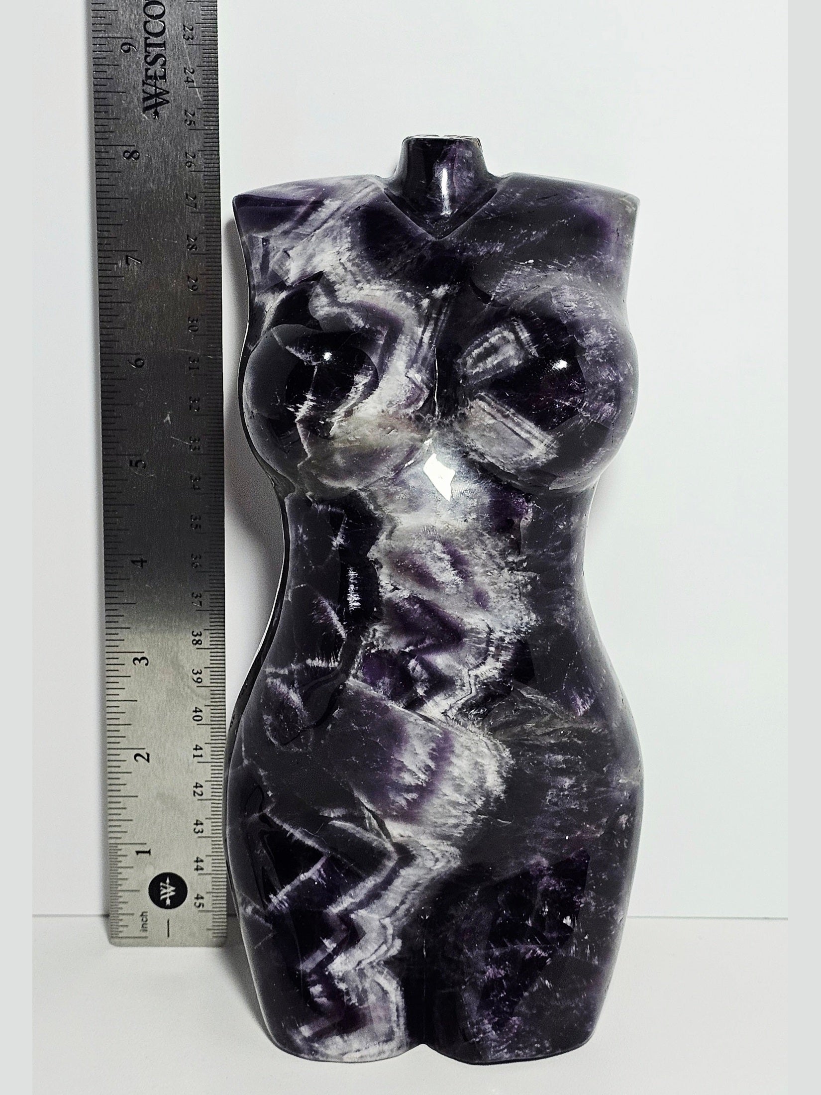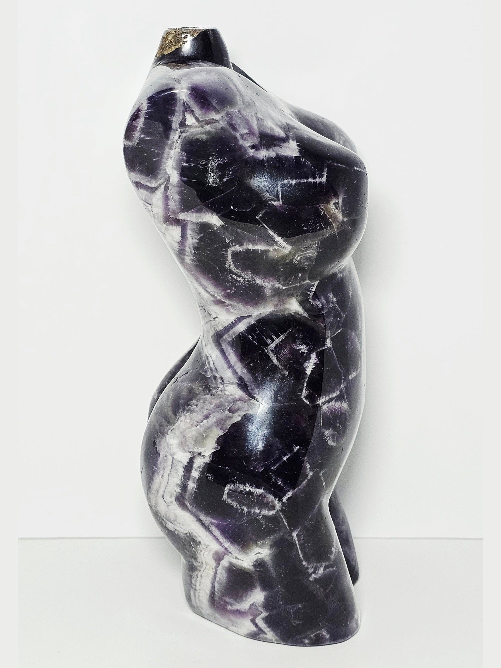 Dream Amethyst (also known as Chevron Amethyst) merges the clarity of Quartz with the spiritual depth of Amethyst, forming a natural amplifier of higher consciousness. It is said to calm the mind, enhance dreams and intuition, and create a powerful shield of light energy around its keeper. The feminine form honors self-love, confidence, and the sacred vessel of creation - making this piece a stunning altar centerpiece or display of empowerment and divine femininity.