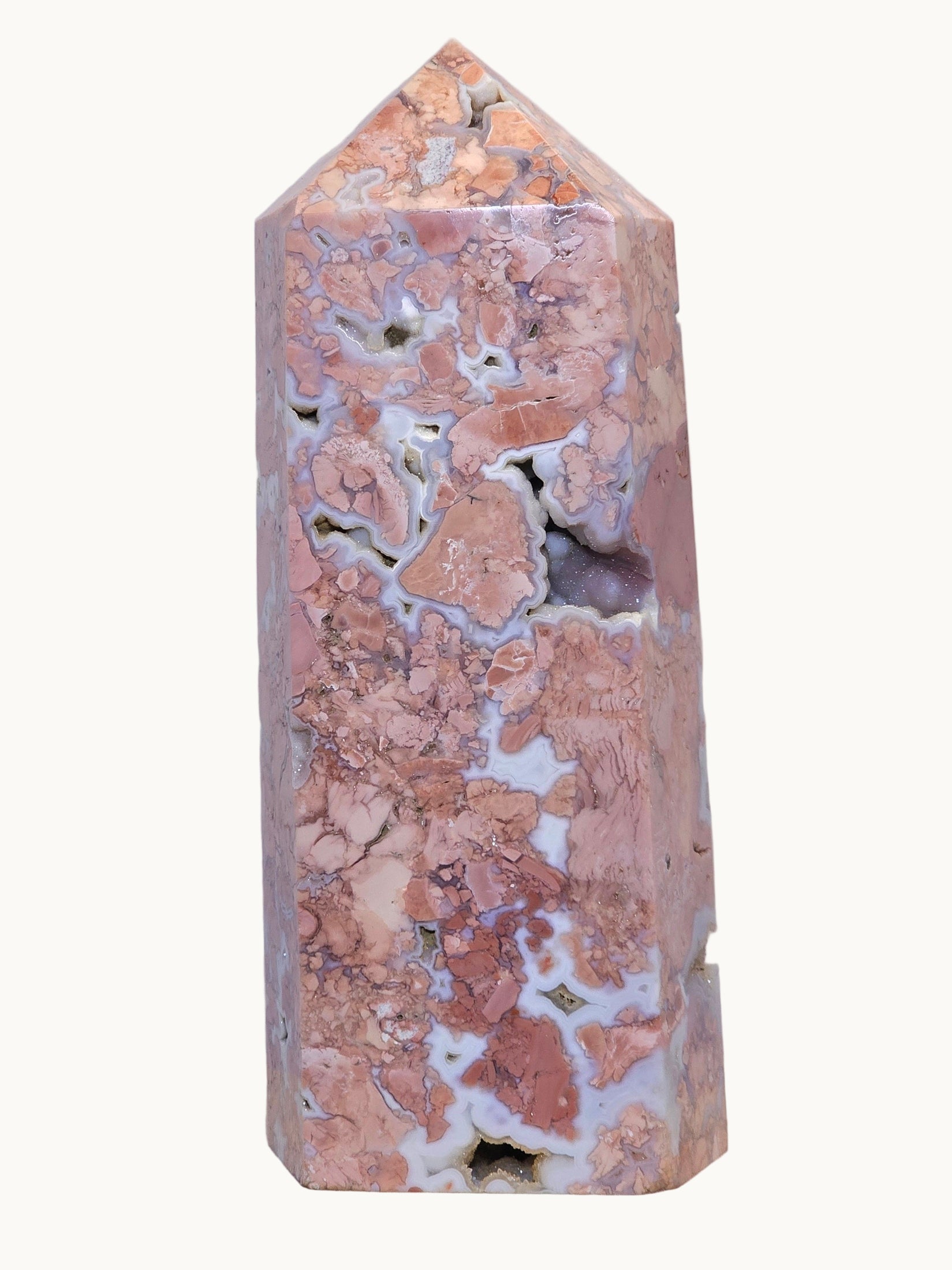 This tower is more than just a crystal - it’s a centerpiece of serenity. In spiritual practice, pink stones are tied to love, compassion, and the heart chakra, while agate itself is revered for steadying the spirit. Place it in your sacred space or home to welcome a constant stream of tenderness, comfort, and emotional renewal.