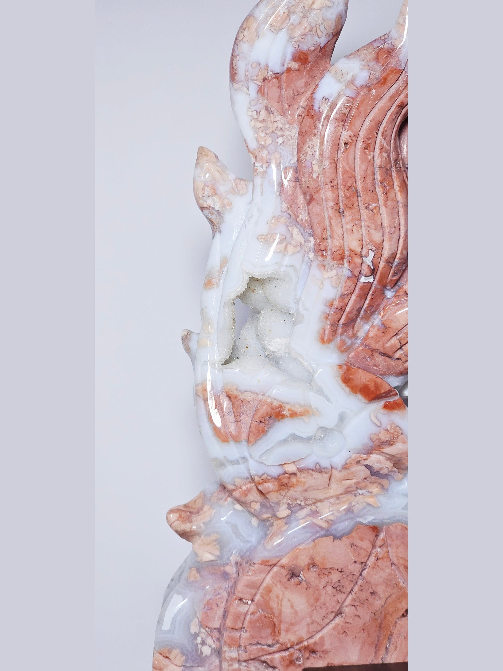 Enchanting and full of life, this nine-tailed fox carving in Pink Flower Agate reveals delicate flower-like patterns and sparkling druzy pockets. Flower Agate is celebrated as a stone of growth, renewal, and blossoming potential, while the druzy crystals within amplify energy and radiate pure light.